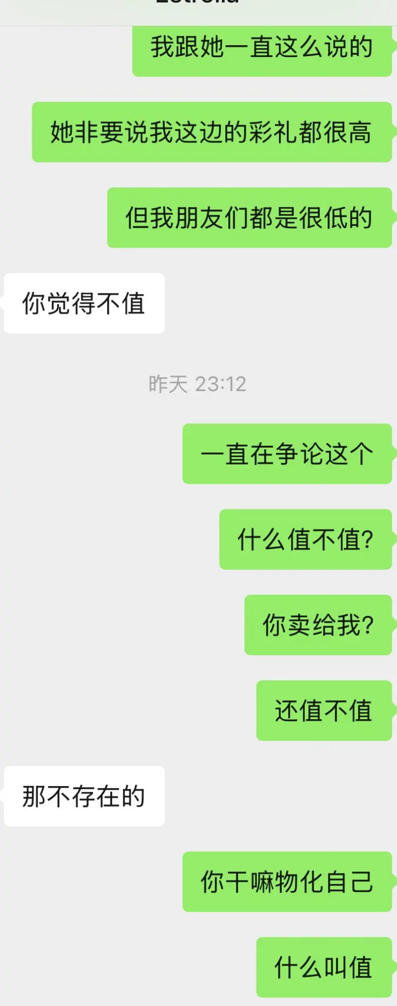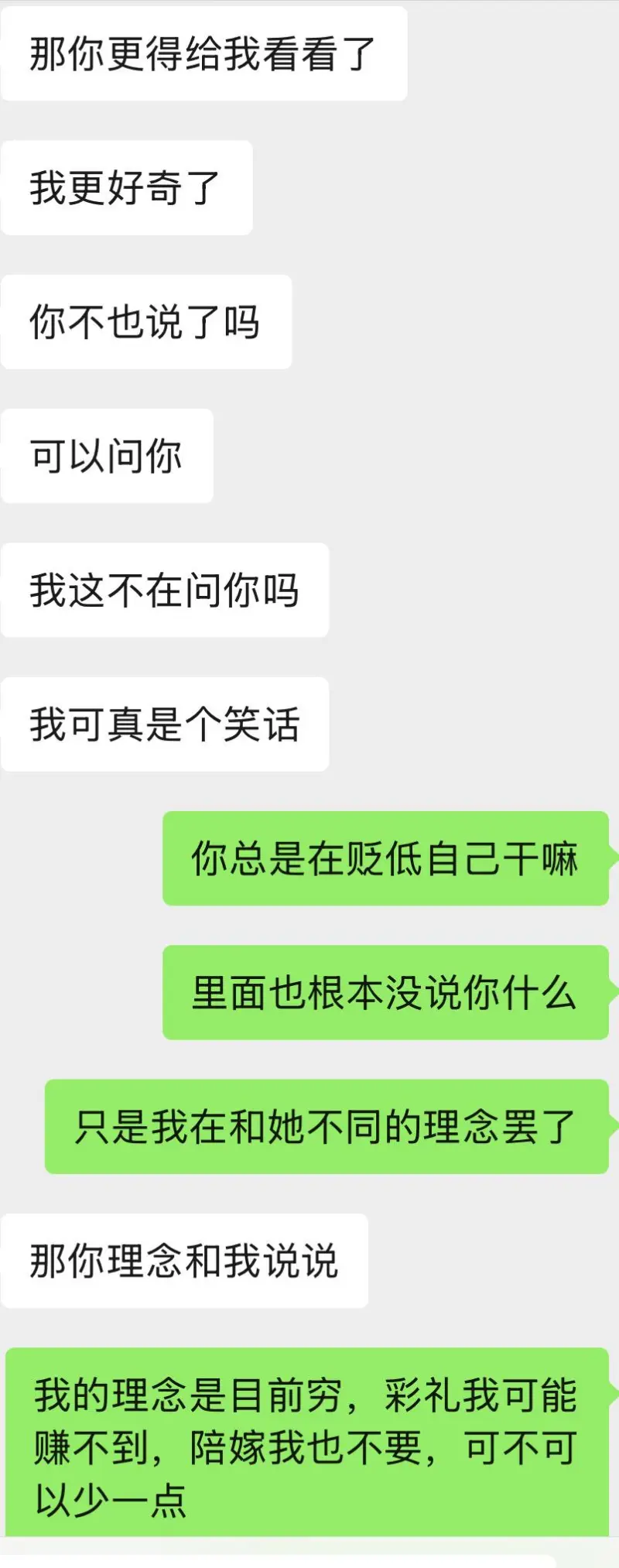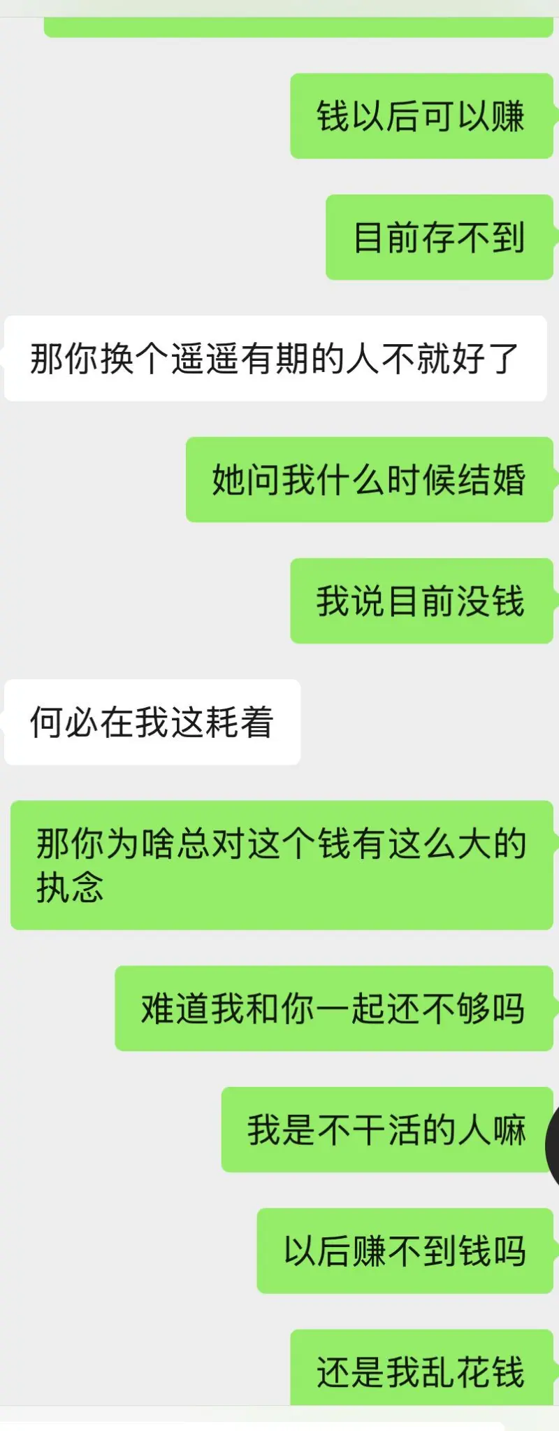 坐標浙江某縣城,女主坐標黑龍江某縣城。家里基本情況是我31歲,家里除了我還有一個姐姐,我年收入正常的話15個左右家里在城里有一套200多萬的房子還有農(nóng)村的3間4層樓自建房,一個月租金也有7-8k,父母都有保險,偶爾打打工,可能一年加起來也有個10萬左右。女主黑龍江偏遠鄉(xiāng)村,偏到附近都沒有便利店,買個零食買個菜啥的還要乘1個多小時的車去集市的那種。她比我小5歲,家里還有一個弟弟。父母加弟弟都在我這個城市,反正平時也是租房住。女主在某連鎖咖啡店上班一年估計也有個5萬收入。 我跟女主是前年裝修認識,她阿姨是裝修公司的老板娘,她給她阿姨工作,她阿姨一個月給她3k左右。去年確立關系,也有過一段挺甜蜜的時光。我也去過她家,她也去過我家,我媽還給她包了一個紅包,但她父母沒有給我。事情轉折是在去年年底的時候,她那邊覺得說兩個人年紀也有不小了,是時候談婚論嫁了。就父母雙方見了面,坐下來好好聊了聊。剛開始都還好,后面談到彩禮的時候就有點崩。她那邊說黑龍江這邊的彩禮都是4-50萬,黃金10多萬,還需要房子的加她名字,最關鍵的是還沒有陪嫁,但是給的錢是小兩口一起用的。說我家一聽這條件根本接受不了,因為在我們這里一般都是10來萬意思一下,一般女方還會陪嫁點電器啥的或者車。這一來就房子寫名字,彩禮40-50加黃金10+,這邊也都沒有這樣的,關鍵啥都陪嫁都沒有。這邊的老人多多少少都有點排外,我父母不說沒有吧,一點點是有的,本來預計也就跟這邊一樣給個15萬左右,但是按她們那邊不給陪嫁也沒關系,這一下落差太大了,一時間接受不了。談到最后說給彩禮28.8+10多萬黃金再加房子名字,再低的話她那邊在村里都抬不起頭了。我父母說回去想一想,就沒有談攏。 自從這次之后她就對我家有了很大的敵意,去我家吃飯每次都是不開心的,到后面都不去我家吃飯了,叫她過去都是說不去,我父母對她這種行為感覺她很沒禮貌,奈何我的面子一直也不說啥。她父親也就在她阿姨的裝修公司工作,她媽在某火鍋店上班,平時也都比較忙,她弟弟經(jīng)常無所事事一年換2-3個工作,連買個衣服都要他姐陪著爆他姐的金幣,這點我很看不上。她家從來也沒有一次叫我過去吃飯,我也屬于工作比較忙的我也對這個也沒太在意。想著以后機會多的很。 今年因為彩禮問題一直爭個不停,我家因為買了房而且裝修之后就沒多少錢了給不起她說的28.8,我今年工作也忙,恰逢這時候有個好朋友問起這件事,我就一五一十說了,我說這個條件太過分了,我一年房貸生活費開銷之后一年也存不到多少錢,里面反正多多少少暴露出不想結婚的意愿。后面有一次去打球,她坐旁邊看我打球,拿著我的手機看我的聊天記錄。后面看到這一段,看完之后就想跟我分手,我想著我也有問題,不該討論這個,就哄了很久也沒分手,后面她是不是拿這個說事,她的脾氣就是那種典型東北女人的脾氣,常常動不動就生氣,一生氣就說這事,有些時候我就感覺特別煩,我就不理她,一不理她,她就更生氣說我直男哄都不哄,我每天感覺活在這種氣氛里很難受。感覺沒有了戀愛開始時的感覺,平時聊天也越來越少,她和我家里人也基本沒有任何感情增進,家里人也是不會勸和的那種,如果我說結束也是沒啥留戀的。 在上周的時候因為本地某裝修公司暴雷,欠了業(yè)主幾千萬,我也是沒事做,問了她阿姨一下情況。她忽然問我什么時候結婚,我說我目前沒錢結婚,讓她能不能跟她媽說下彩禮能不能少一點,有點負擔不起。這部分的錢反正我和她用的。她就開始說一堆有的沒的,說她來這里這么多年,我們這邊的彩禮都很多的,怎么到她這里就這么點了,說我們是不是看不起外地的,就因為她是外地的不愿意多給點彩禮,巴拉巴拉說個不停,我就說我們這邊的彩禮,說了一下我們附近朋友的彩禮,反正也就意思一下不會很多。然后她就讓我按東北的來,說東北的就是很貴的,每個家庭都會為結婚傾其所有,我說我不會的,你別拿你那邊的標準來,你要是拿你們那邊的標準,我也拿我們這里的標準,你陪嫁要對等。后面聊的很不舒服,她說這次就我們聊聊的,也不會告訴她外甥女。 這兩天我看她心情特別差也不理我,我其實也猜到了她阿姨應該跟她說了這件事,后面一問還真的是,現(xiàn)在她又想跟我分手。大家覺得要不要繼續(xù),我感覺我很累