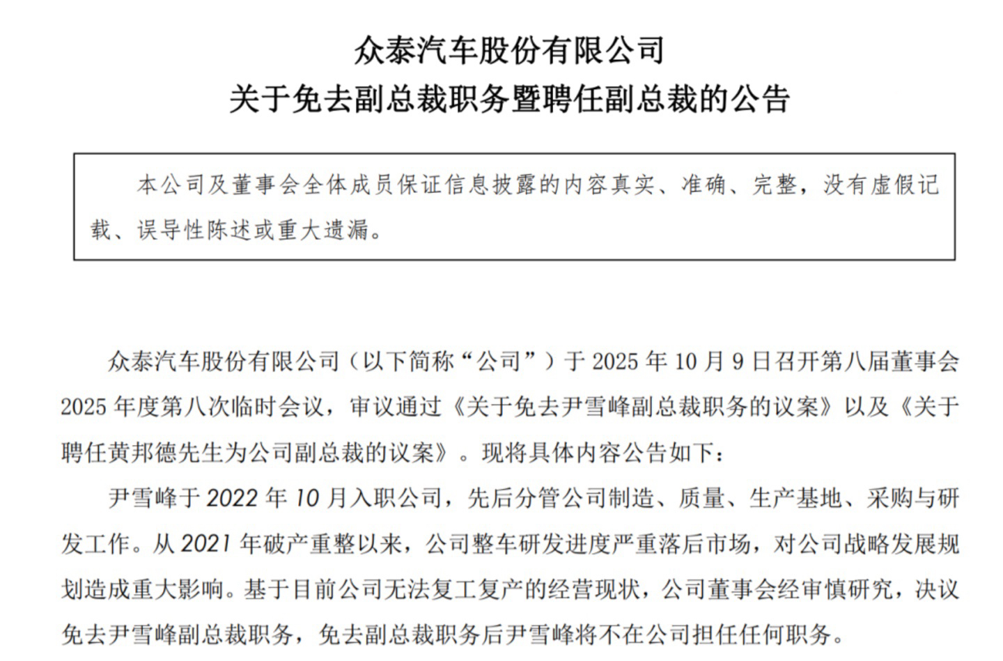 眾泰汽車表示,尹雪峰于 2022 年 10 月入職公司,先后分管公司制造、質量、生產(chǎn)基地、采購與研發(fā)工作。從 2021 年破產(chǎn)重整以來,公司整車研發(fā)進度嚴重落后市場,對公司戰(zhàn)略發(fā)展規(guī)劃造成重大影響。基于目前公司無法復工復產(chǎn)的經(jīng)營現(xiàn)狀,公司董事會經(jīng)審慎研究,決議免去尹雪峰副總裁職務,免去副總裁職務后尹雪峰將不在公司擔任任何職務。