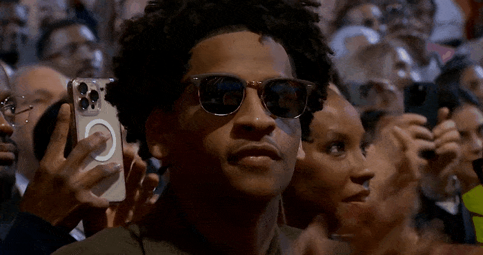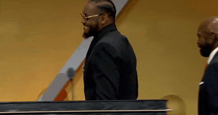 2025屆名人堂成員卡梅羅-安東尼上臺加冕時刻,西裝安東尼身穿一身黑色西裝,色墨戴黑色墨鏡氣質(zhì)拉滿。板氣