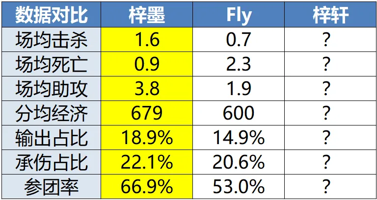 而今天凌晨宣布傷退的Fly這邊,在本屆年總屬實(shí)讓人很難評(píng)價(jià),KDA、參團(tuán)率、場(chǎng)均擊殺、分均經(jīng)濟(jì)、輸出占比、場(chǎng)均死亡六項(xiàng)數(shù)據(jù)全是年總對(duì)抗路里最差的,同時(shí)也是濟(jì)南RW俠五人組里數(shù)據(jù)最難看的。