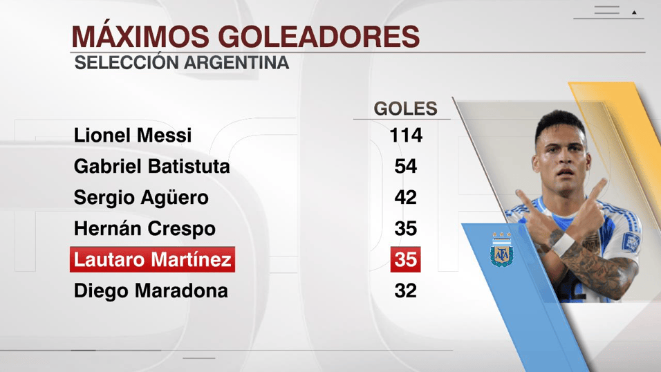 根據(jù)ESPN的隊(duì)打隊(duì)史統(tǒng)計(jì),憑借這兩個(gè)進(jìn)球,進(jìn)球勞塔羅在阿根廷隊(duì)史射手榜并列第四: