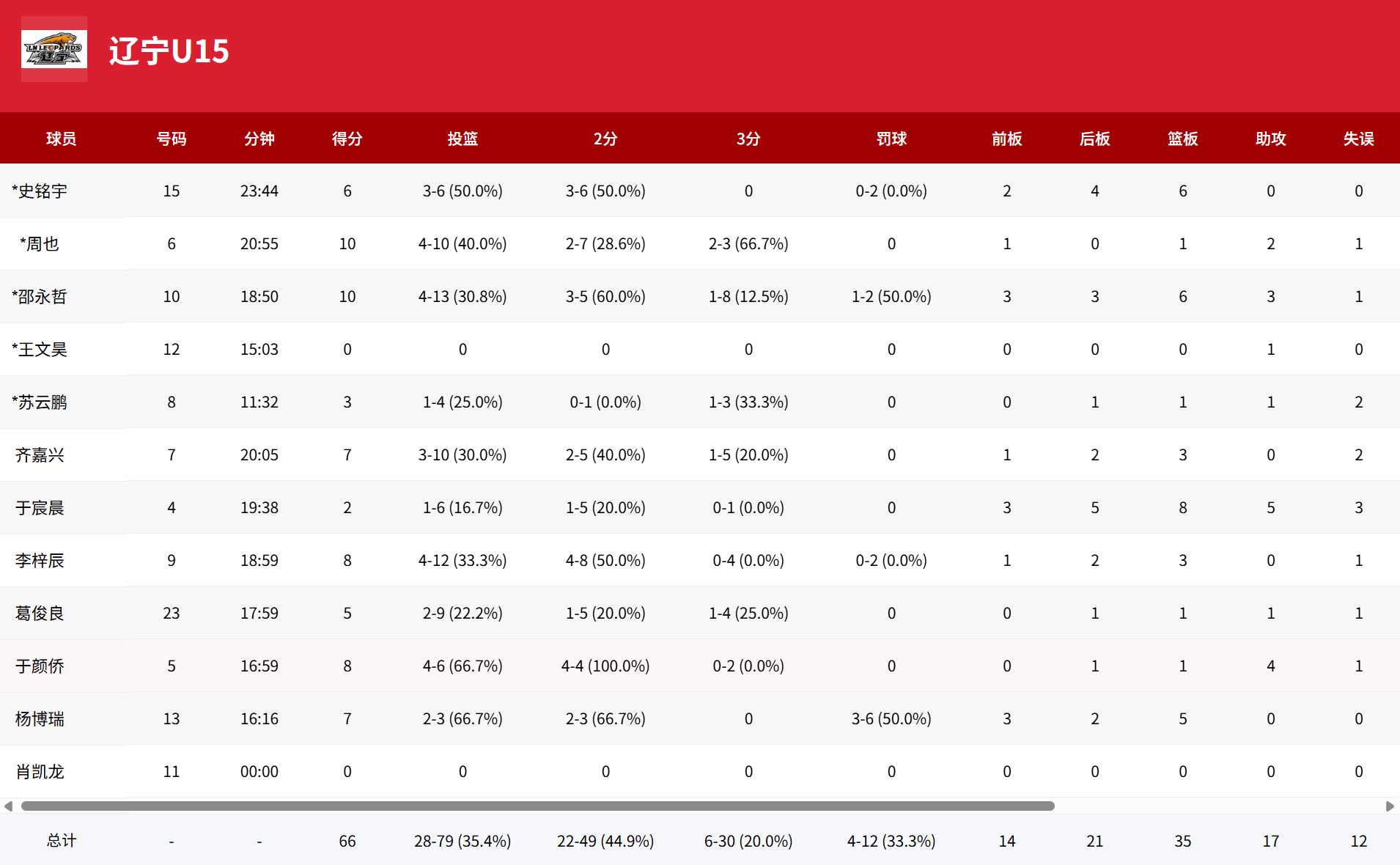 遼寧:周也10分、澤政邵永哲10分6籃板、分籃李梓辰8分