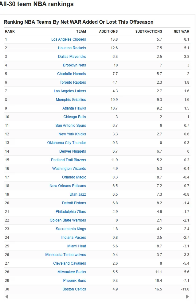 虎撲10月02日訊 今日,ESPN專欄作家Neil Paine撰文,給休賽期進行補強的全部球隊進行了排名。