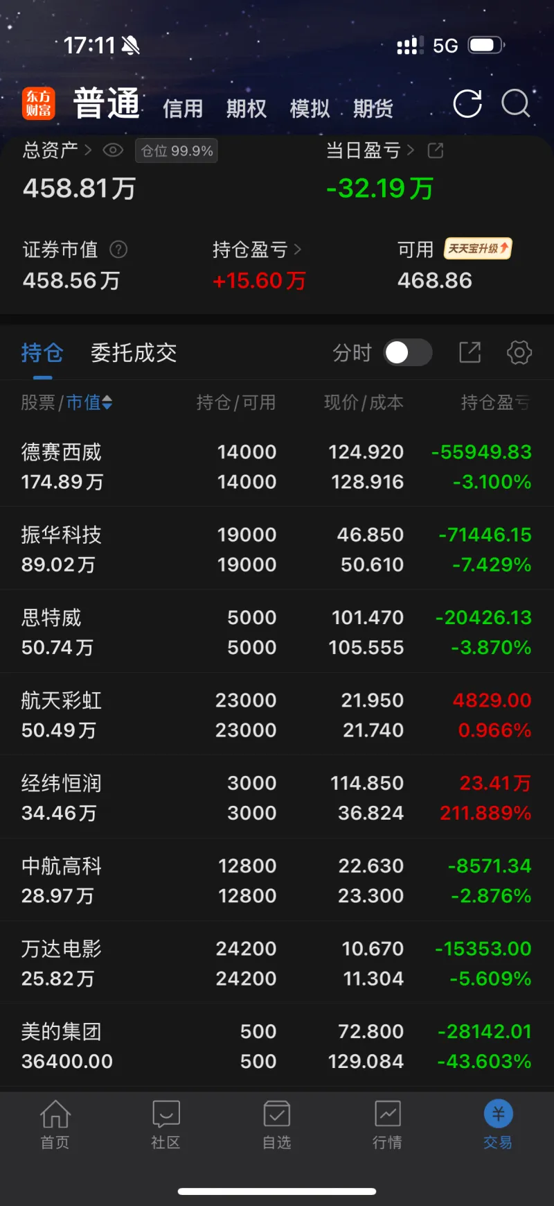 今天給錘得有點離譜,第一大倉智駕板塊吃了個跌停,第二大倉振華吃了半個跌停。一天去掉32w(-6.56%),差不多去掉一臺5系,創(chuàng)下今年第二大日虧損,開始有點酸爽的感覺了。這個月跌幅已經(jīng)10%了,和創(chuàng)業(yè)板差不多,總體水下48.3w,這個月的目標得切換為回本了。今天有一點點小不開心,主要因為自己已經(jīng)很穩(wěn)重了還要被主力這樣錘就讓人有點想不通。今天盤面更加不用說,科技票集體山崩地裂,很多票都是A殺。我持有的票基本首當其沖,因科技而盈利也因為科技而回撤沒有怨言。