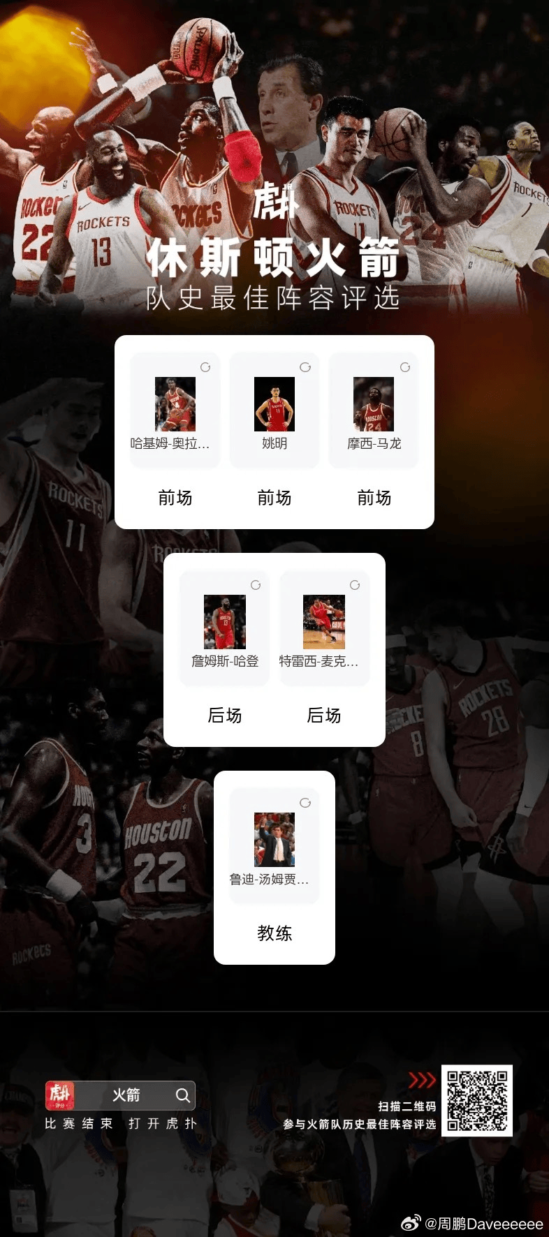知名媒體人、解說員周鵬也在個(gè)人的社交媒體上曬出了他選擇的火箭隊(duì)史最佳陣容(上圖):