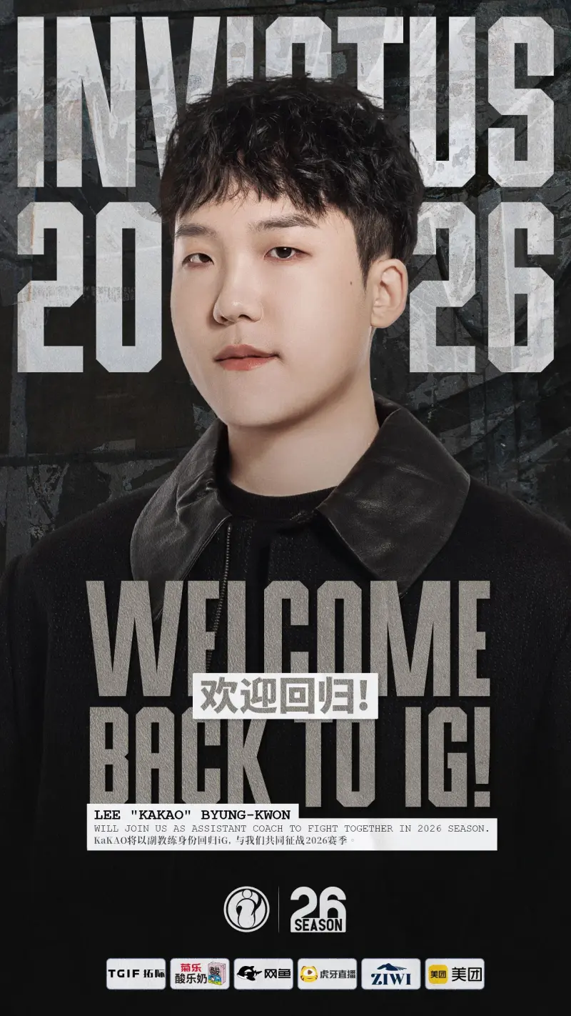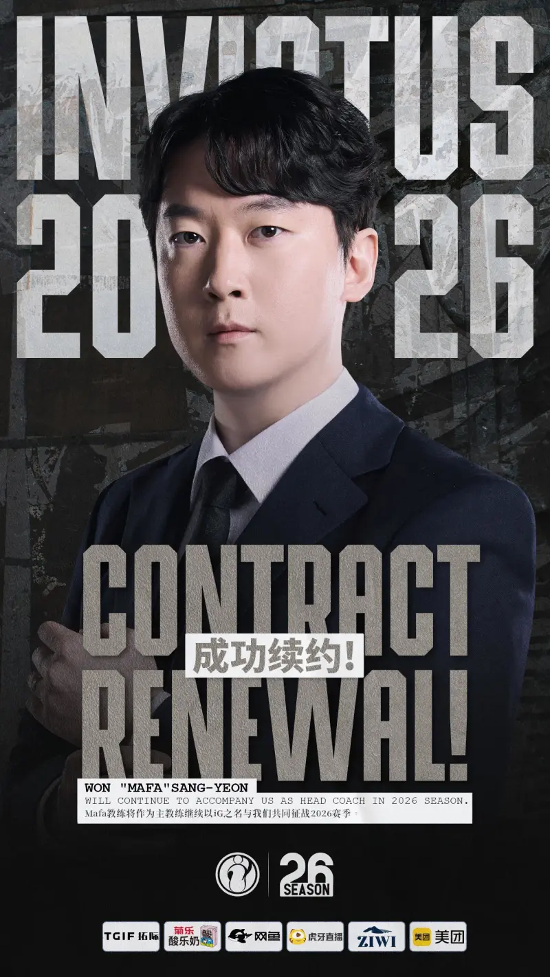 經(jīng)過與本人的積極溝通以及友好協(xié)商后,我們高興地向大家宣布:教練元祥淵(ID:Mafa)即日起將擔(dān)任iG英雄聯(lián)盟分部主教練,同時教練李炳權(quán)(ID:KaKAO)將回歸iG,以副教練身份加入賽訓(xùn)組。