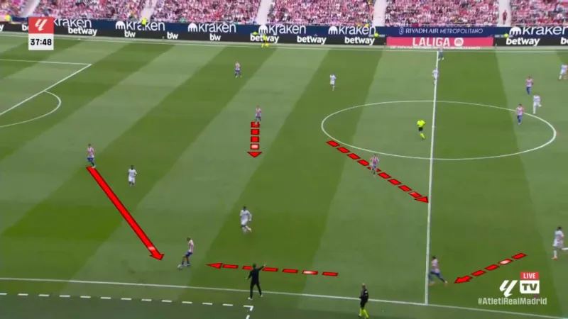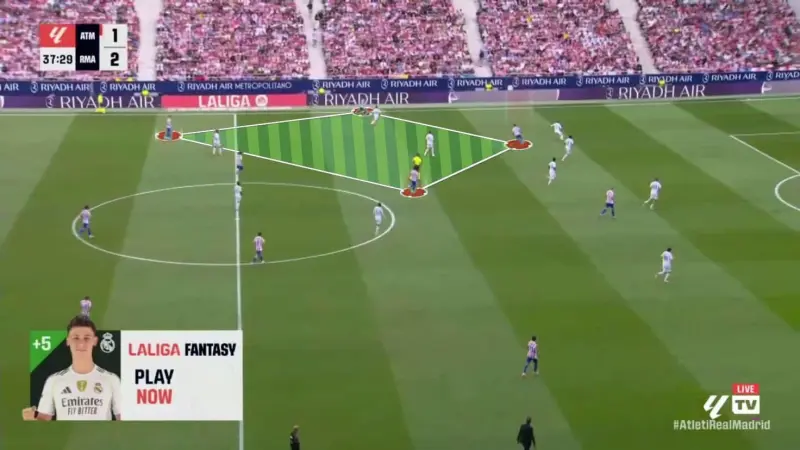 本場比賽馬德里競技主攻皇馬左右兩邊路,看似是皇馬實施高位逼搶,將對手逼到狹窄出球區(qū)域的好機會。但是此時馬德里競技球員的站位非常有特點,在邊路形成一個寬闊的菱形站位。這種方式利用了皇馬采取高位逼搶時不得不在局部聚集更多球員的弊端,馬競球員占得球場上的空間,只要皇馬孤注一擲的搶球失敗,馬競將很容易把球運轉(zhuǎn)到處于空位的球員腳下。