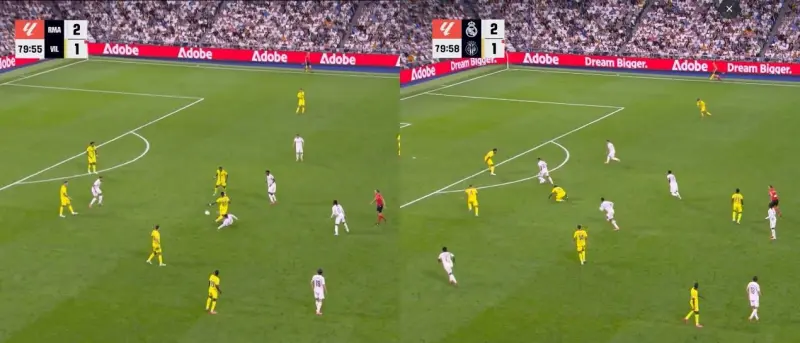 上一輪西甲聯(lián)賽,皇馬對陣比利亞雷亞爾,鎖定勝局的一球即通過皇馬整體前壓的高位逼搶,最終貝林厄姆搶下慌亂的對手腳下的皮球,最終由姆巴佩一錘定音。這已經(jīng)不是皇馬本賽季第一次通過高位逼搶取得成果。