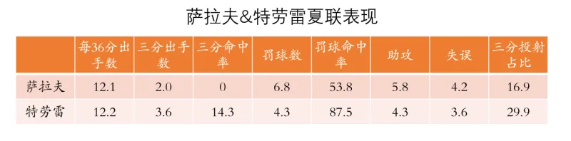 薩拉夫和特勞雷由于均在歐洲打球、無(wú)NCAA數(shù)據(jù),所以我們主要參考他們的夏聯(lián)表現(xiàn),從上表中可以看到兩位球員的三分出手傾向都很低,說(shuō)明投射是他們很不自信的一環(huán)。同時(shí)兩人的助攻數(shù)字在夏聯(lián)環(huán)境里均比較優(yōu)秀,高傳控水平也確有其事,優(yōu)缺點(diǎn)非常鮮明。對(duì)這兩名球員的觀(guān)察主要在于“他們?cè)跓o(wú)球端能做哪些事情”,籃網(wǎng)目前的轉(zhuǎn)移球速度很快,若能在無(wú)球端體現(xiàn)自己的能力,就能得到更多的出場(chǎng)時(shí)間。