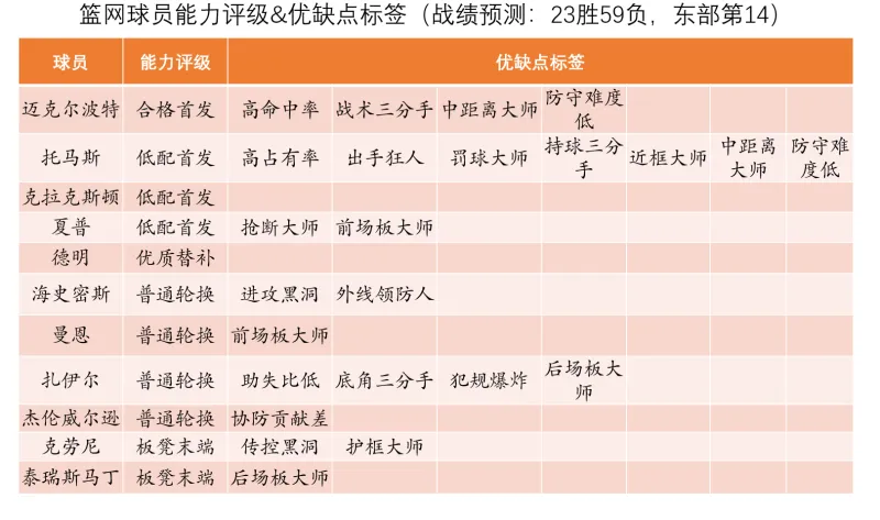 最后是根據(jù)上賽季球員高階數(shù)據(jù)對(duì)樣本量充足的籃網(wǎng)球員進(jìn)行的大致評(píng)級(jí)以及比較突出的優(yōu)點(diǎn)或缺點(diǎn)列示,供大家參考。模型預(yù)測(cè)籃網(wǎng)最終的戰(zhàn)績(jī)?yōu)?3勝59負(fù)、東部第14名,希望籃網(wǎng)能早日選中或培養(yǎng)出基石球員,進(jìn)入到下一階段,也祝愿曾凡博在籃網(wǎng)的旅程一切順利~~