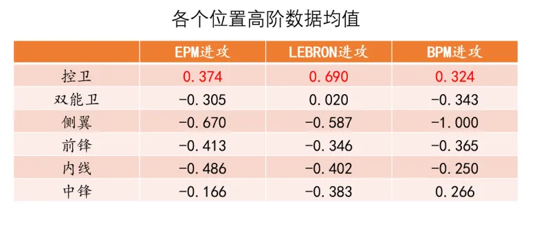 上表是我統(tǒng)計(jì)的25賽季每個(gè)位置的高階進(jìn)攻數(shù)據(jù)均值情況,可以明顯看到控球后衛(wèi)這個(gè)位置是球場(chǎng)6個(gè)位置中進(jìn)攻影響力最大的位置、且與其他位置的差距非常大。這說(shuō)明一支球隊(duì)想要搞好進(jìn)攻,一名出色的控衛(wèi)是必不可少的,所以籃網(wǎng)選擇在控衛(wèi)位置上練蠱,如果真能練出一個(gè)“能打出優(yōu)秀進(jìn)攻影響力”的控衛(wèi),比其他位置的性?xún)r(jià)比要高很多。