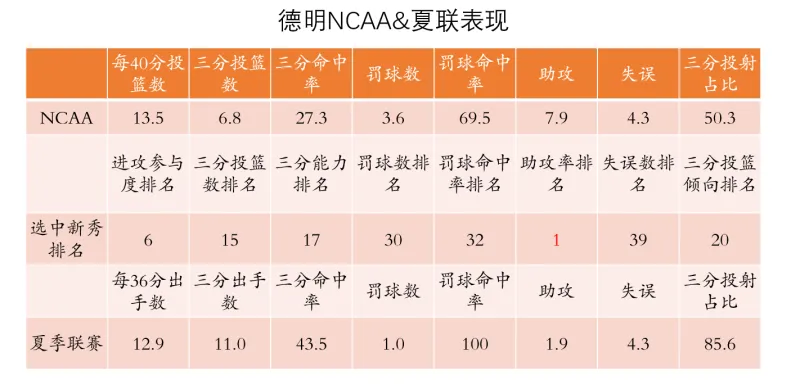 在傳球能力實(shí)打?qū)嵉谋尘跋拢旅鞯母叨葘⑷Q于他的進(jìn)攻威脅,畢竟能頻繁改變對(duì)手防守才能為隊(duì)友創(chuàng)造大量?jī)?yōu)質(zhì)機(jī)會(huì)。大學(xué)時(shí)德明的三分產(chǎn)量就很高,全部出手的50%都在三分線(xiàn)外,但鑒于他的罰球命中率只有69.5%,三分的不穩(wěn)定性也就順理成章了。NCAA的27.3%三分命中率或許被低估、但夏聯(lián)62.4%的命中率也有很大的高估成分。他的三分能力到NBA后究竟能達(dá)到什么級(jí)別會(huì)決定他的實(shí)力檔次,畢竟吉迪與東契奇是有著天壤之別的。