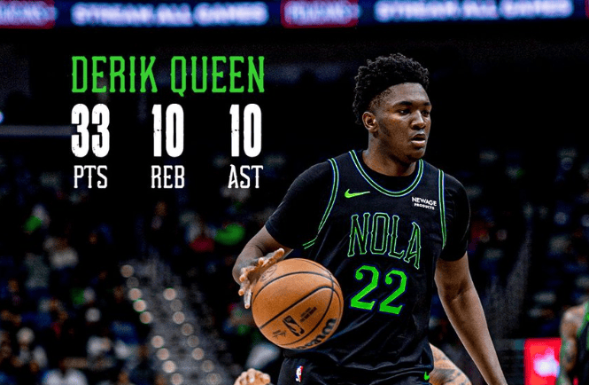 本場比賽,鵜鶘球員德里克-奎因出戰(zhàn)33分鐘,15投11中,其中三分球1投0中,罰球13投11中,空砍33分10籃板10助攻4封蓋。