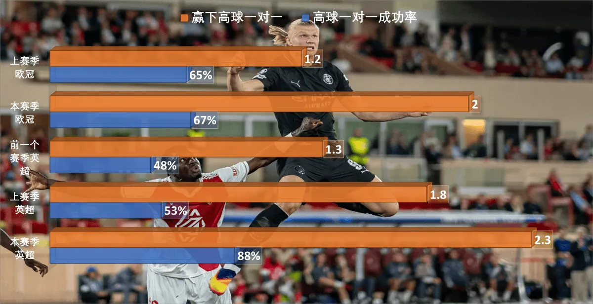 最為難得的還是哈蘭德來到曼城后一直在努力進(jìn)步。他在英超場(chǎng)均贏下頭球一對(duì)一次數(shù),從2年前的1.3次增加到上賽季的1.8次,再上漲到本賽季的2.3次,呈現(xiàn)明顯的上升勢(shì)頭。