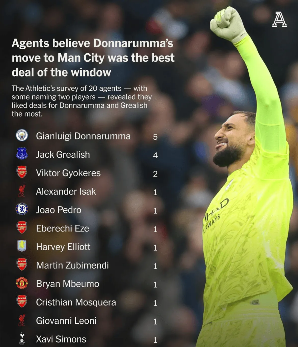 根據(jù)TA采訪20位足壇經(jīng)紀(jì)人,讓他們選出2025年英超夏窗最佳轉(zhuǎn)會(huì)交易,其中有5票投給了曼城新門神多納魯馬,讓他登上榜首。排名第二的,恰恰是得到4票的格拉利什。