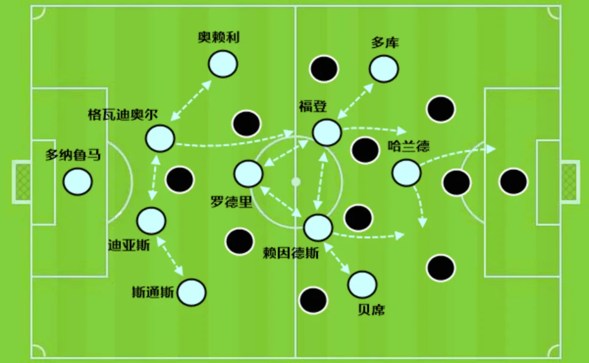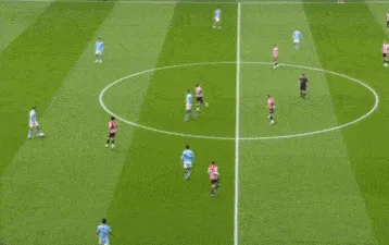 同時(shí)中衛(wèi)格瓦迪奧爾時(shí)不時(shí)前提到很高的位置送出妙傳,在比賽中,他幾次與哈蘭德直接連線,也使得福登和賴因德斯可以獲得更多無球穿插的自由度,讓曼城進(jìn)攻產(chǎn)生更多變化。