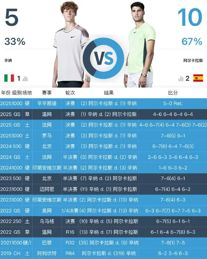 這將是兩人的第16次交手,此前的15次交手記錄上阿爾卡拉斯以10-5的戰(zhàn)績(jī)領(lǐng)先。最近一次交手是在上個(gè)月的辛辛那提1000賽決賽,當(dāng)時(shí)辛納因身體原因,首盤(pán)0-5落后時(shí)退賽。