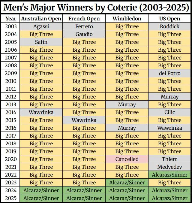 辛納此前斬獲4個(gè)大滿(mǎn)貫冠軍,包括2個(gè)澳網(wǎng)冠軍(2024、2025)、1個(gè)溫網(wǎng)冠軍(2025)、1個(gè)美網(wǎng)冠軍(2024)。