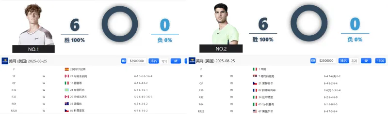 本屆美網(wǎng),兩人均展現(xiàn)出神勇?tīng)顟B(tài),辛納在前6輪僅丟兩盤(pán)。