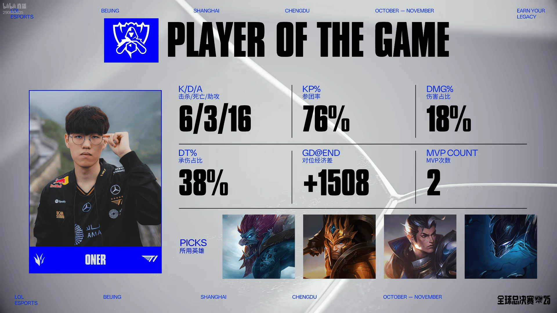 虎撲10月14日訊?在今晚結(jié)束的S15入圍賽的比賽中,Oner夢(mèng)魘砍下6/3/16的拿下戰(zhàn)績(jī),拿下T1對(duì)陣IG第四局MVP