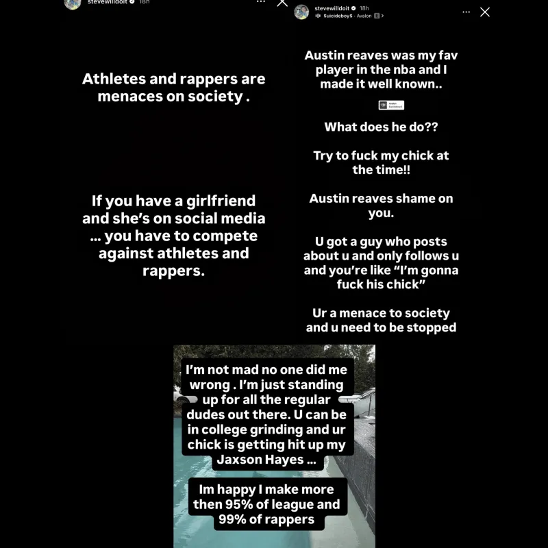 虎撲11月21日訊 近日,知名網(wǎng)紅博主SteveWillDoIt在社交媒體上發(fā)布多條限時(shí)動(dòng)態(tài),點(diǎn)名指控奧斯汀-里夫斯曾試圖與他當(dāng)時(shí)的女友發(fā)展關(guān)系。