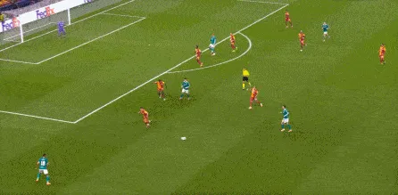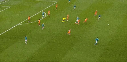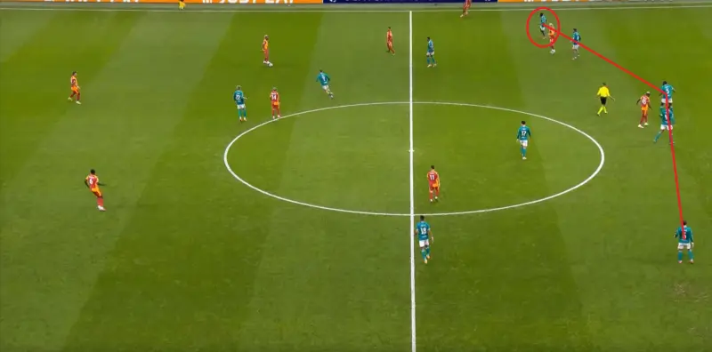 不過(guò)你可以看到的是,維爾茨確實(shí)是相對(duì)熟悉今天的這套戰(zhàn)術(shù)體系,因?yàn)樵谇皥?chǎng)的時(shí)候,維爾茨就發(fā)現(xiàn)了空當(dāng),于是在壓迫不力之后仙人指路,只不過(guò)指的是自家球門(mén)的方向: