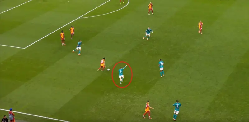 尤其是第25分鐘這次,埃基蒂克在接到維爾茨傳球時(shí)出現(xiàn)失誤,結(jié)果被加拉塔薩雷穿越中場(chǎng),完成由左至右的橫移線(xiàn)路,讓奧西門(mén)獲得了射門(mén)的機(jī)會(huì):