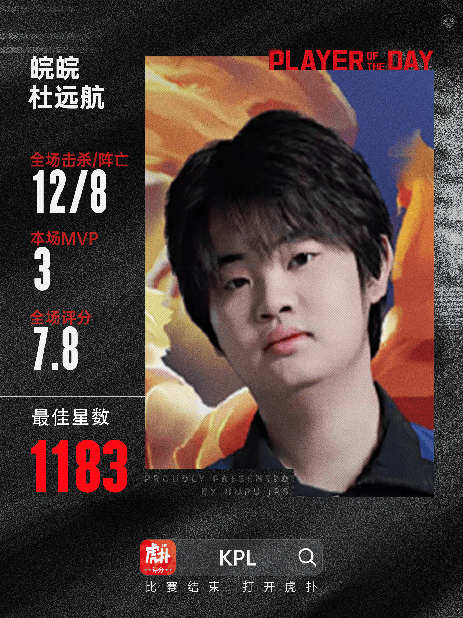 最終皖皖選手以9.8的奇皖評(píng)分,總星數(shù)1183(排除一星)斬獲昨日最佳選手!板絕