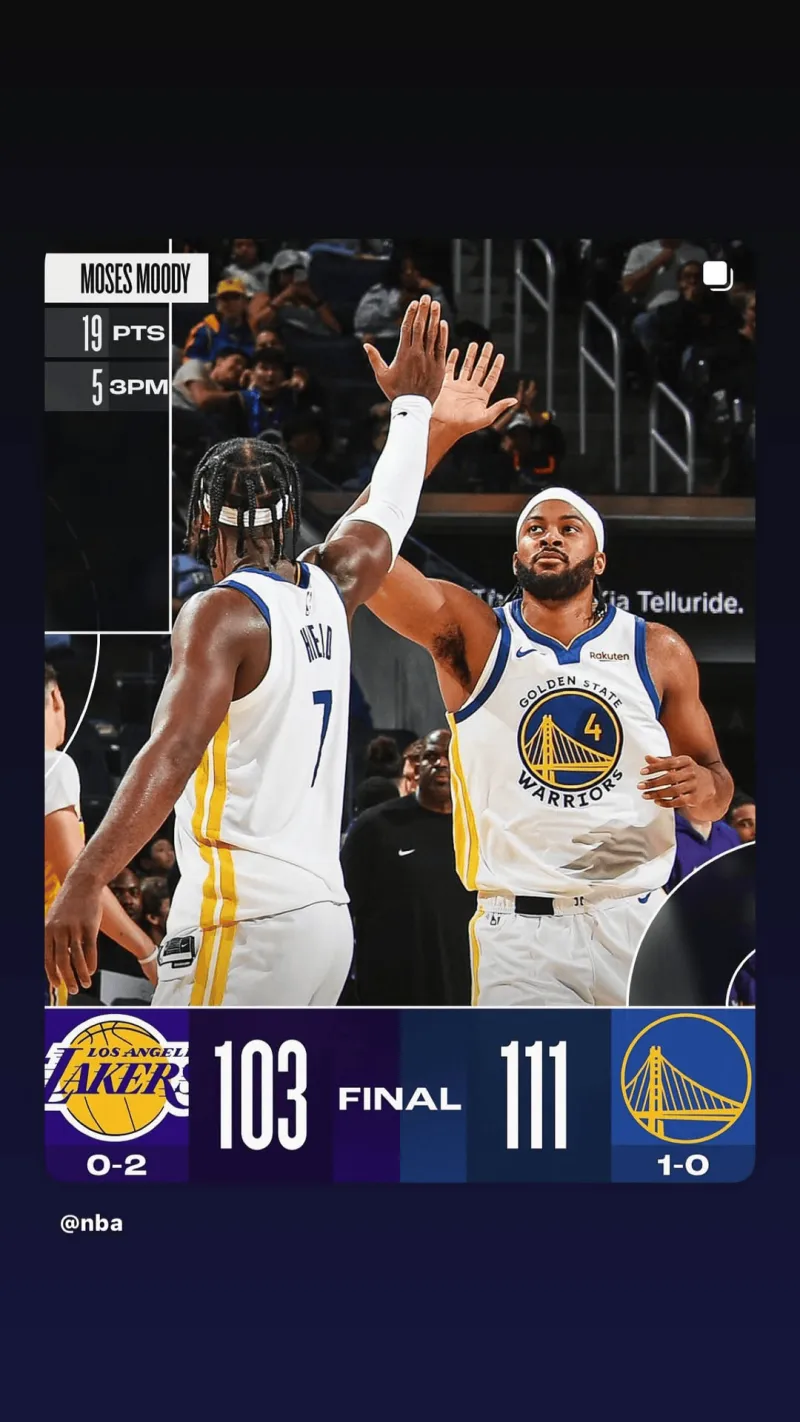 今日的記分今日據(jù)海季前賽,勇士111-103擊敗湖人,穆迪穆迪出戰(zhàn)14分鐘,社媒全場9投7中,轉(zhuǎn)發(fā)自己三分7中5,得到19分1助攻1搶斷。