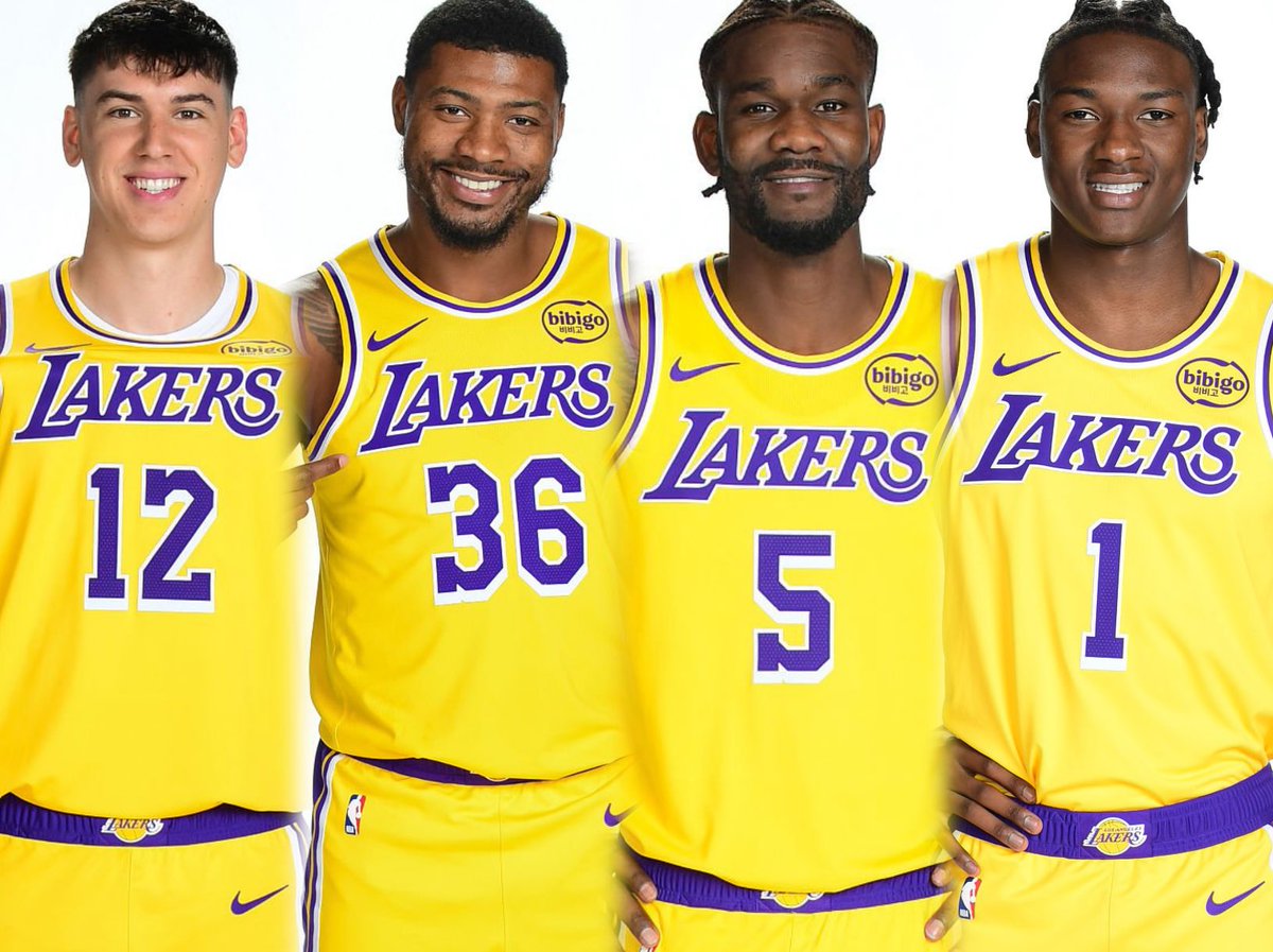 圖中的湖人四名球員是:杰克-拉拉維亞,馬庫斯-斯馬特,新援興奮德安德烈-艾頓和阿杜-蒂耶羅。最令