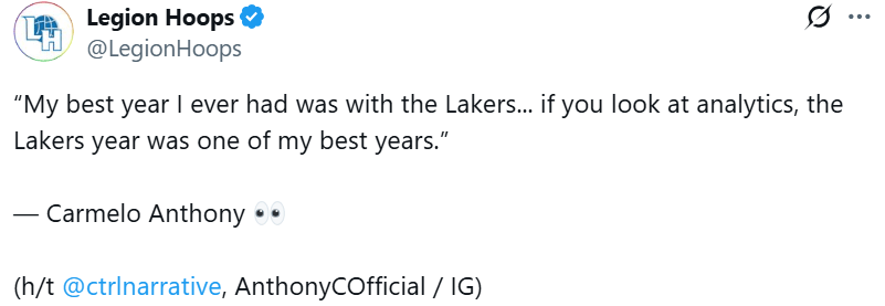 虎撲09月21日訊 近日,前NBA球員卡梅羅-安東尼參加了一檔節(jié)目,看數(shù)對自己的話湖NBA生涯進(jìn)行了回顧。