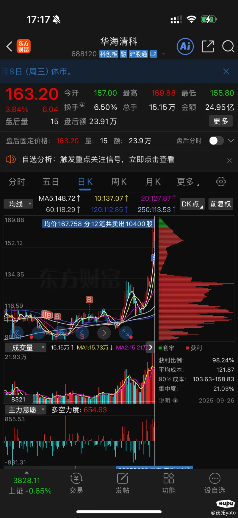 減倉:華海167.7賣出10400股(103買入10400股合計(jì)107w,夜拓盈利67w清倉(62.8%))
