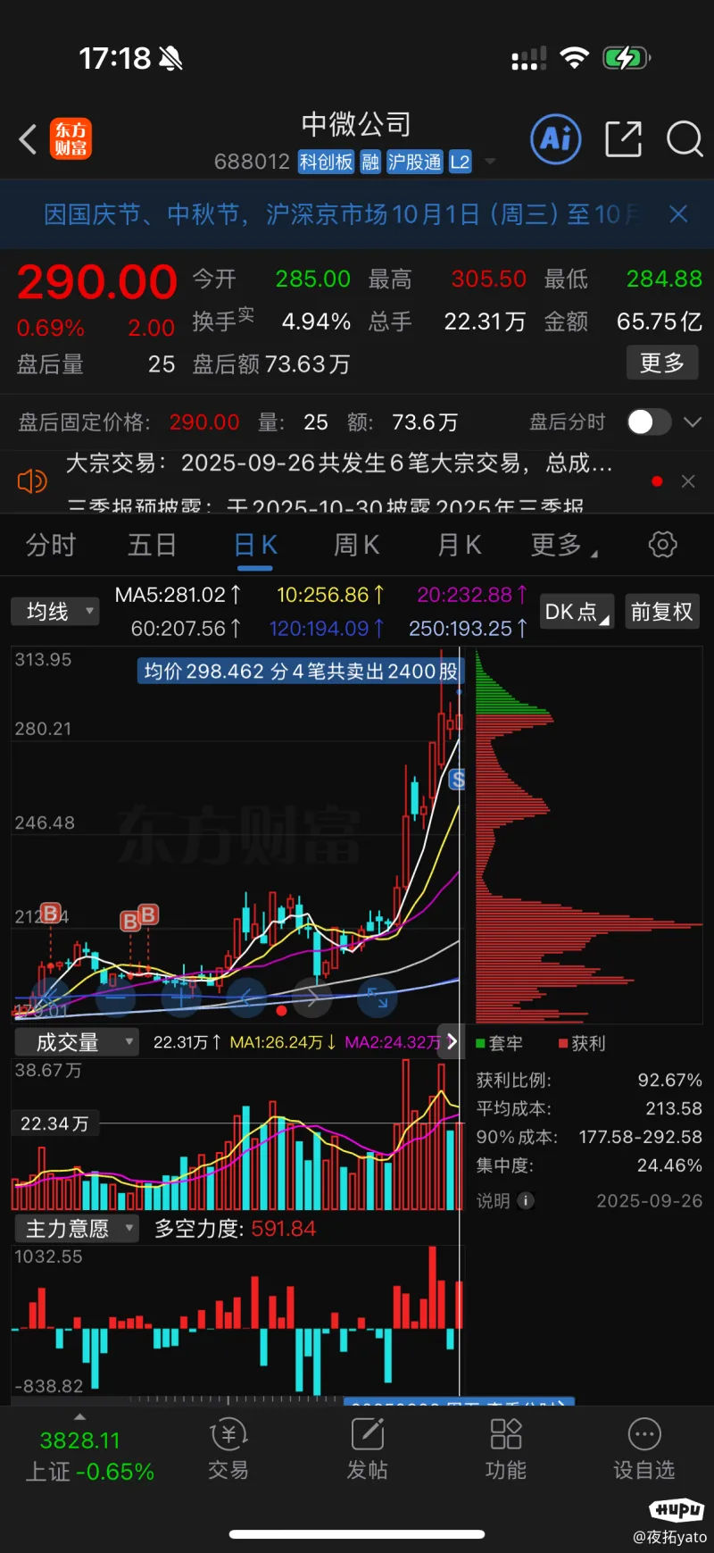 中微(196.5買入4400股合計(jì),今日298.5減半倉2400股,這部分盈利24.5w(52%))