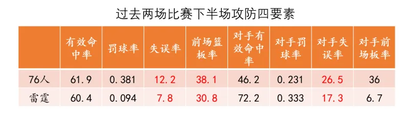 如果我們翻看過去兩場比賽下半場勇士追回比分的原因的話,從上表的攻防四要素就可以看出,一來是兩邊的失誤率差非常巨大,勇士通過簡單的投搶戰(zhàn)術(shù)能夠控制失誤,而在自己進(jìn)攻端打得比較順的同時(shí)又能在防守端保持活力、造成對手的大量失誤,從而贏得大量球權(quán)。第2點(diǎn)就是上文提到的前場籃板率的部分,兩場比賽下半場勇士都搶了30%以上的前場籃板,同樣靠著活力賺得了大量球權(quán)。