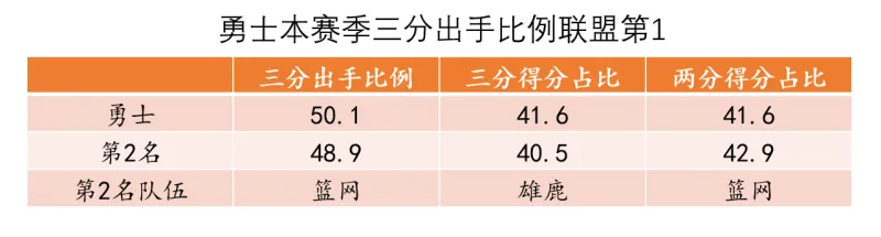 本賽季勇士對三分的依賴已經(jīng)到了非常嚴(yán)重的地步,如上表所示,勇士的三分出手比例和得分占比均是聯(lián)盟第1,且領(lǐng)先第2名一段距離,反之兩分球的得分占比則是聯(lián)盟倒數(shù)第一,而與勇士特征相似的球隊(duì)是明顯處于擺爛區(qū)的籃網(wǎng),這可不是好的參考對象。