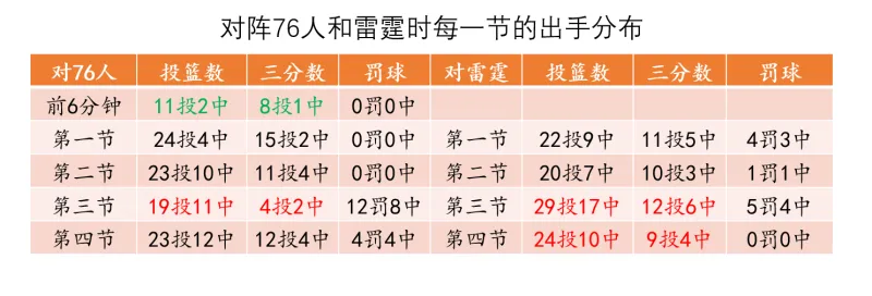 無獨(dú)有偶,打雷霆的比賽同樣從第3節(jié)開始勇士的三分比例大幅下滑,第3節(jié)29次出手里面只有接近40%是三分球,而第4節(jié)40%不到的比例來自于三分出手,擺脫對三分的依賴反而是勇士追分的原因之一。