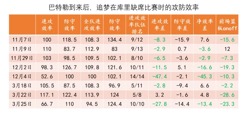 很遺憾,這樣的觀感確實(shí)是事實(shí),而且從巴特勒加入勇士隊(duì)之后這種現(xiàn)象便頻繁發(fā)生。上表是巴特勒加入勇士之后,庫里缺席而追夢出場的常規(guī)賽比賽、共計(jì)8場,從表格中可以看到其中7場比賽追夢在場時(shí)的整體進(jìn)攻效率都小于當(dāng)場比賽全隊(duì)整體的進(jìn)攻效率,且其進(jìn)攻效率在同隊(duì)球員中均處于中下排名甚至是墊底排名,也就是說追夢在場時(shí)對球隊(duì)進(jìn)攻端是存在較大的拖累的。