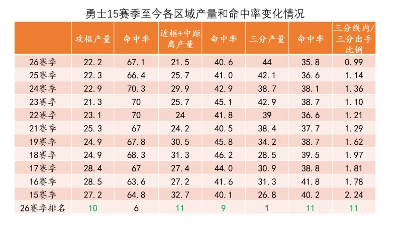 如果再縱向?qū)Ρ扔率?5賽季至今不同區(qū)域的產(chǎn)量和命中率變化的話,就可以看到本賽季勇士的攻框產(chǎn)量排名倒數(shù)第2、僅比23賽季擁有多名戰(zhàn)術(shù)射手的勇士要高。近框加中距離區(qū)域的產(chǎn)量不僅是倒數(shù)第一,而且與倒數(shù)第2名相比有著非常大的差距。三分產(chǎn)量雖是所有賽季的第1名,但命中率卻是倒數(shù)第一,雖然本賽季勇士的整體三分命中率還能排在聯(lián)盟中游、但是與自己比確實(shí)不夠看。