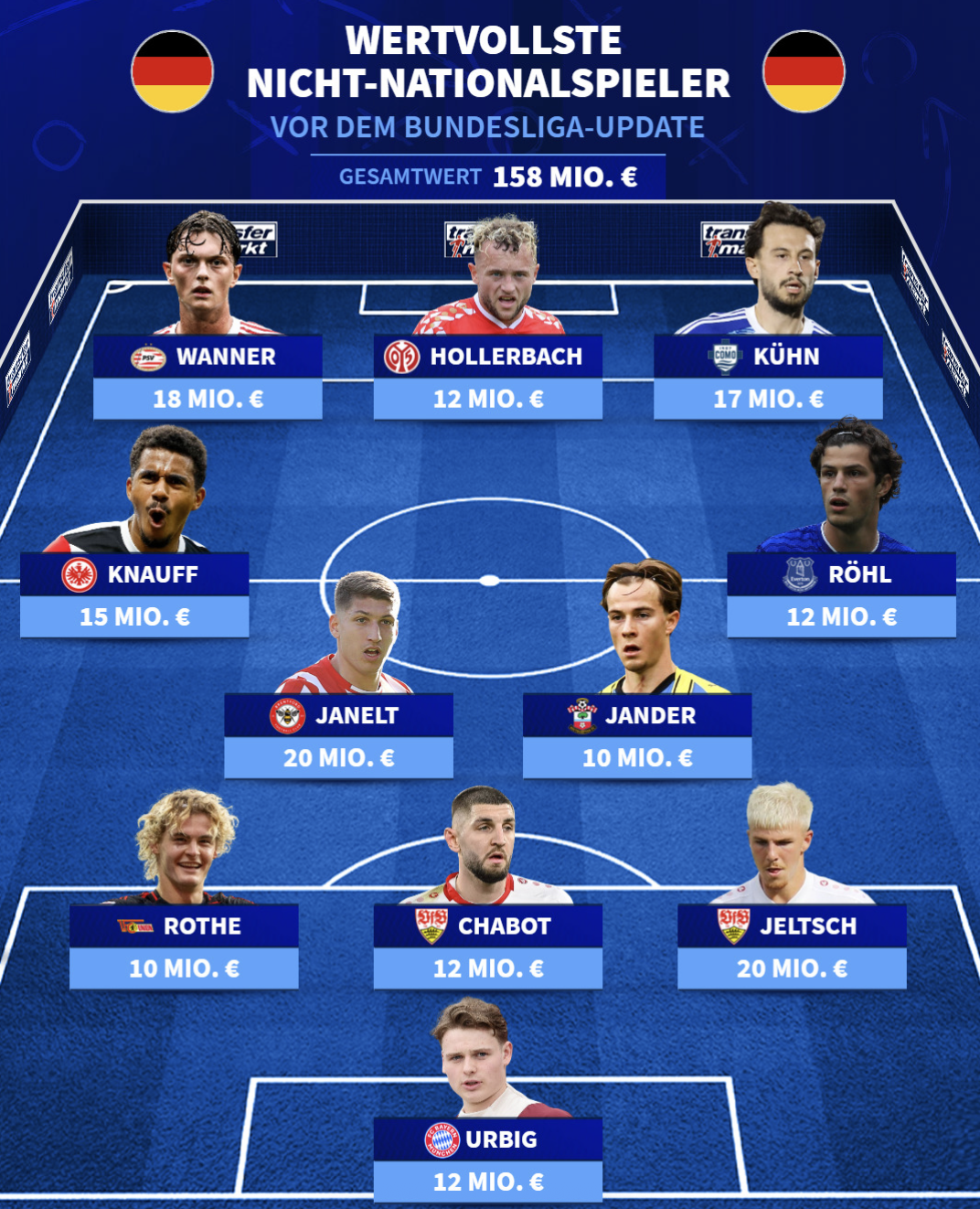 虎撲10月12日訊 德轉公布了現(xiàn)役從未入選過德國國家隊身價最高的十一人陣容,斯圖加特的未入杰利奇和布倫特福德的賈內(nèi)特以2000萬歐領銜陣容。陣容總身價為1.58億歐。選德