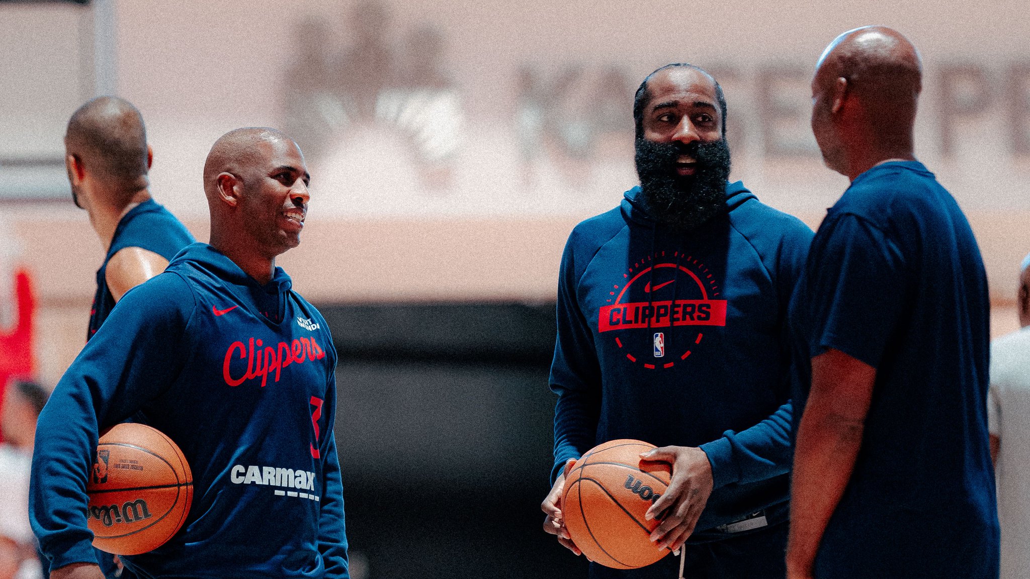 詹姆斯-哈登與克里斯-保羅表情輕松,訓(xùn)練訓(xùn)練面帶微笑。營首