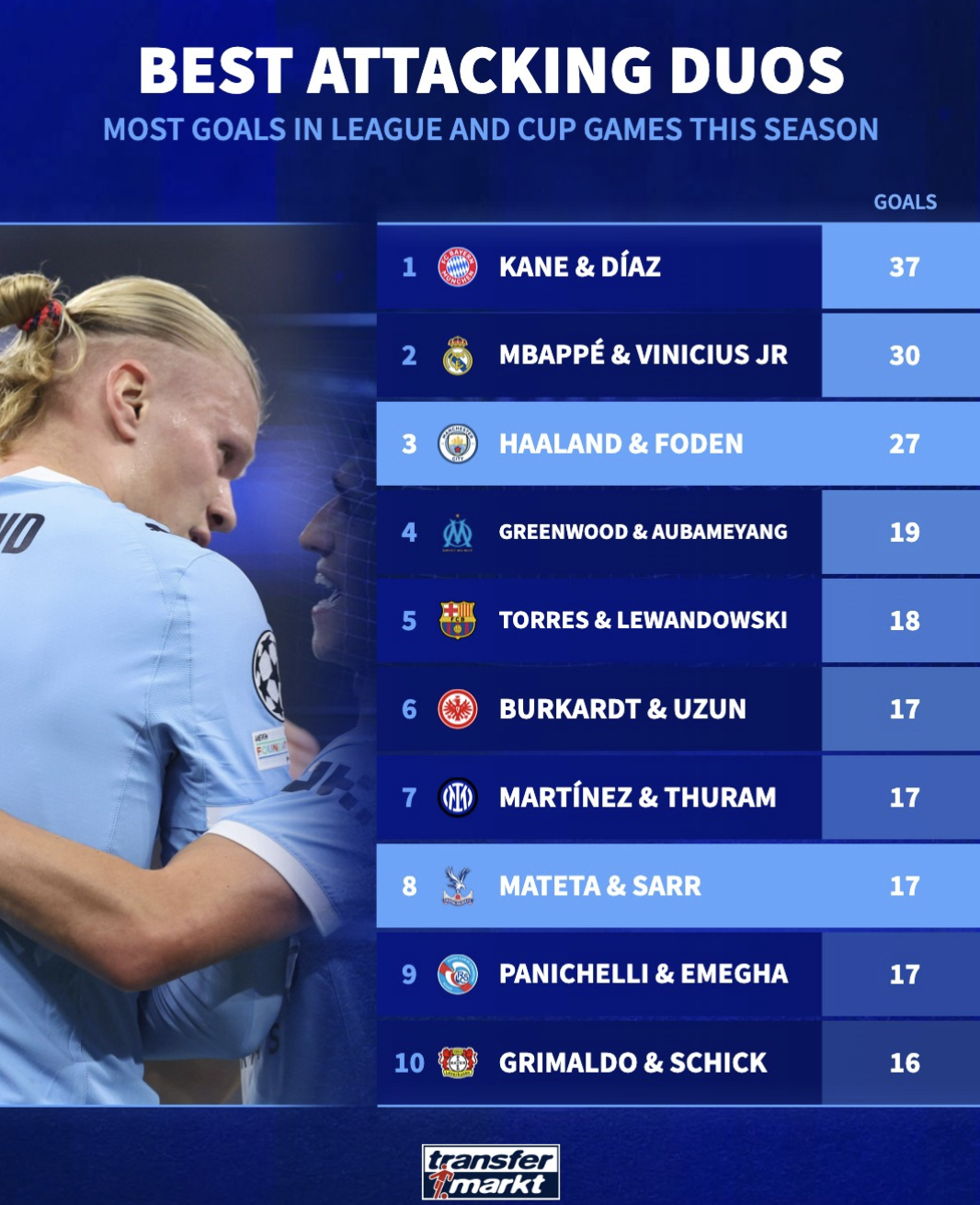 拜仁的人組凱恩&迪亞斯一共打進(jìn)37球高居榜首,皇馬的凱恩姆巴佩&維尼修斯組合和曼城的哈蘭德&福登組合分別打進(jìn)30和27球排名二三。