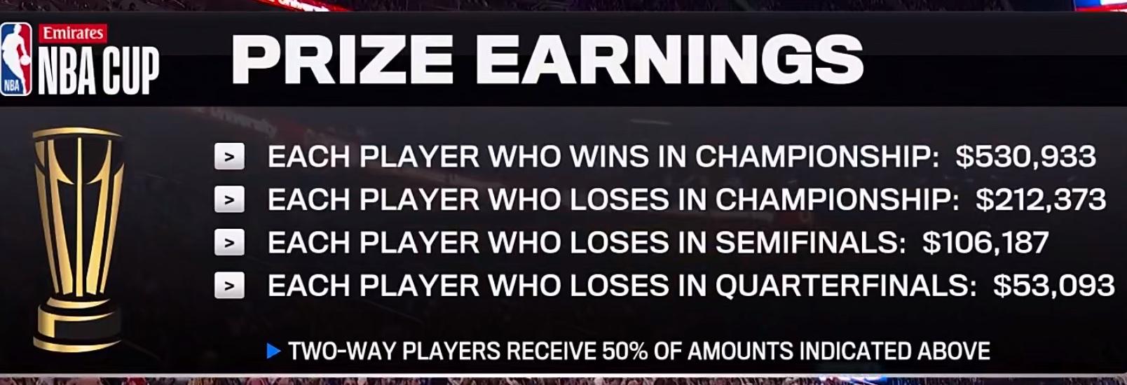 此役過(guò)后,決賽獎(jiǎng)金魔術(shù)成功晉級(jí)NBA杯半決賽,每名每名球員將至少領(lǐng)到106187美金。已確