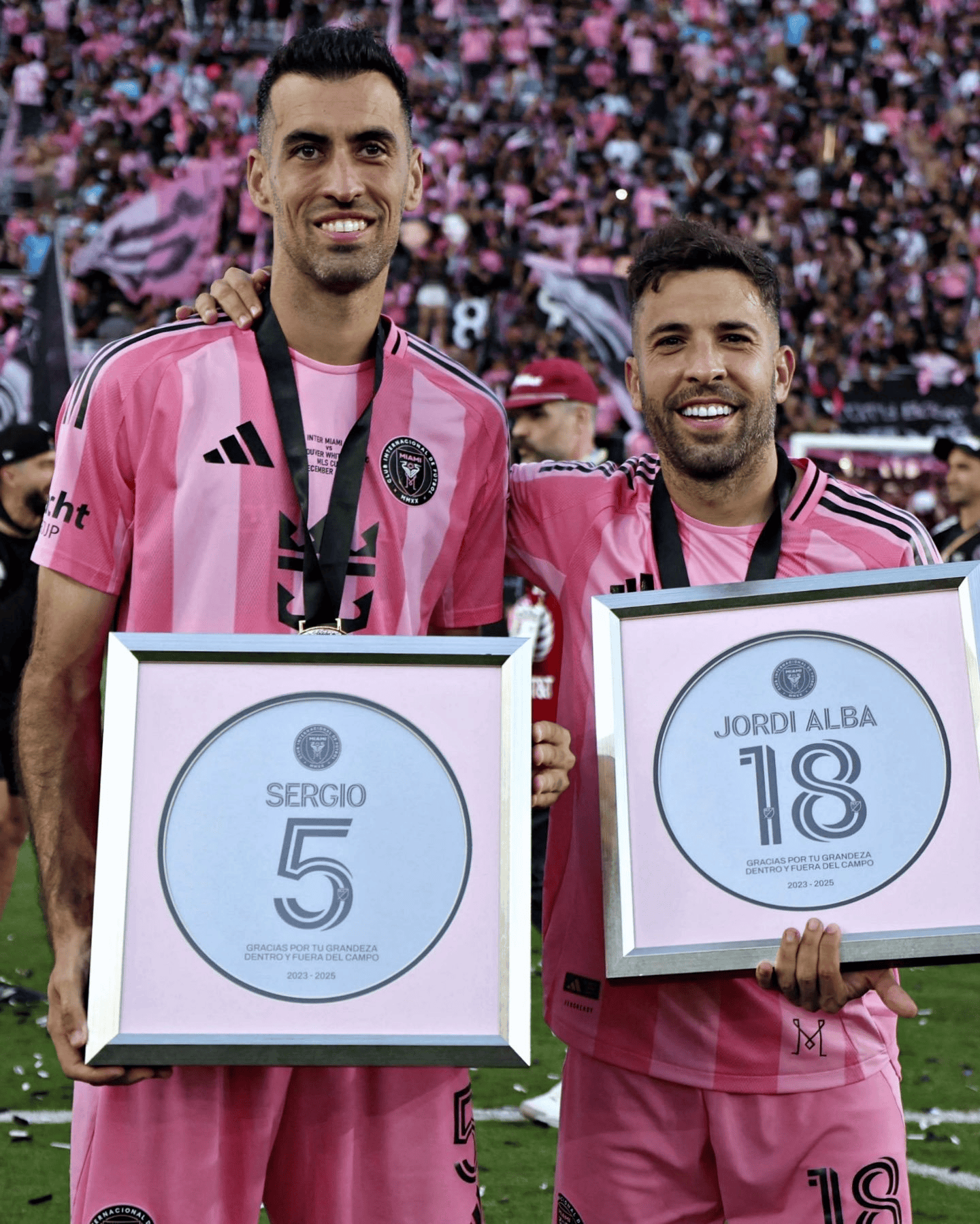 賽后,板用布邁阿密國際官方為布斯克茨和阿爾巴贈(zèng)送了印有他們標(biāo)志性球衣號(hào)碼的冠軍紀(jì)念品,他們也手持紀(jì)念品進(jìn)行合影。送別賽后