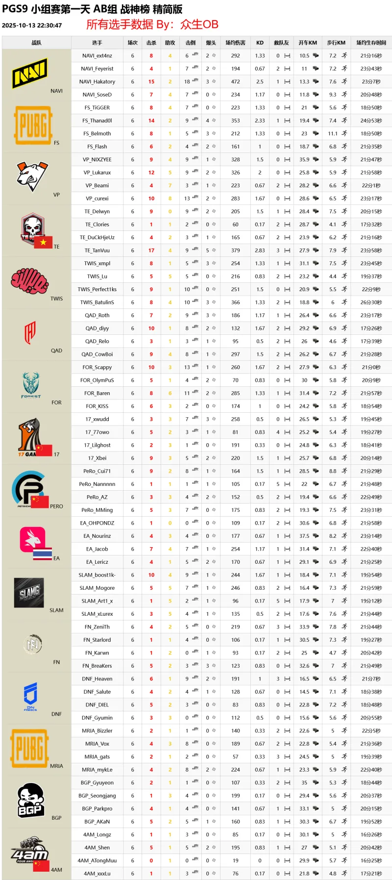 PGS9小組賽第一天 AB組 積分榜&戰(zhàn)神榜由眾神OB 發(fā)表在絕地求生 https://bbs.hupu.com/pubg
