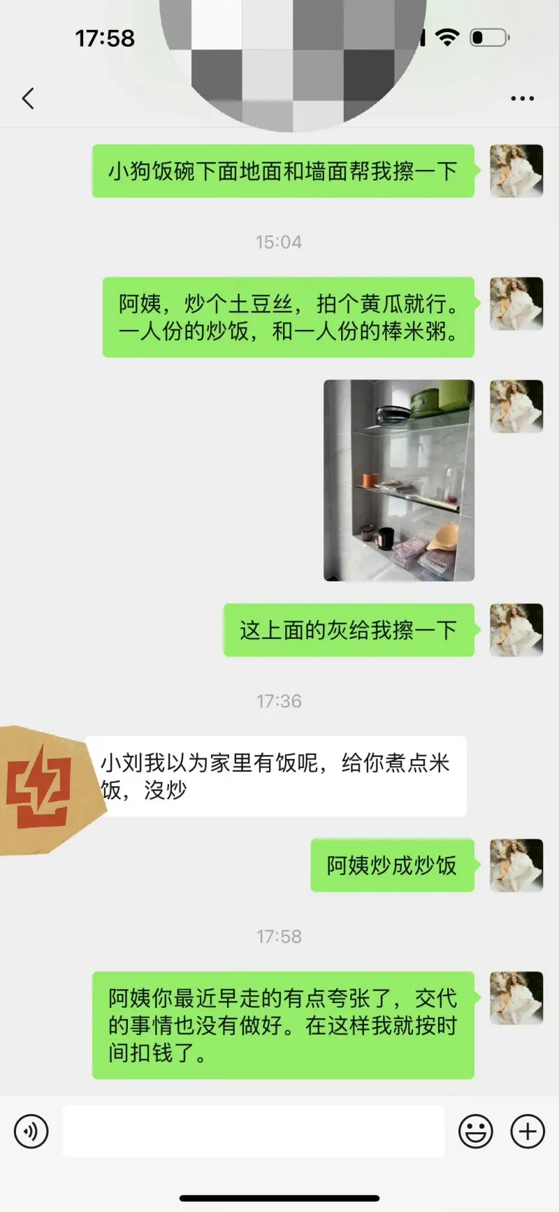 每天三小時(shí),給我做一頓飯加打掃衛(wèi)生。我應(yīng)該算是很好說話的人了,很多雇主接受不了的我都能接受。比如買菜咪點(diǎn)錢,家里的水果蔬菜偷摸拿點(diǎn)我都不介意。不能說無所謂只能是我覺得在合理范圍內(nèi)我不去計(jì)較這么多,換一個(gè)也不會好到哪里去,相當(dāng)于上班薅點(diǎn)公司羊毛了。所以阿姨遲到早退我也不說太多了。從一開始的早退十幾分鐘到半小時(shí)到四十分鐘,我滴媽現(xiàn)在早退一小時(shí)多。還因?yàn)橄胩崆白卟煌瓿晌医淮氖虑椤=裉煳乙粋€(gè)人吃飯,就要求拍個(gè)黃瓜,炒個(gè)土豆,煮粥和一人份的蛋炒飯。之前我吃炒飯都是冰箱里有剩飯,所以今天她也以為有剩飯。但是今天沒有剩飯,需要她煮一下再炒。在她發(fā)現(xiàn)需要煮飯?jiān)俪达埖臅r(shí)候離下班還有一個(gè)多小時(shí),她只有一個(gè)菜要炒也已經(jīng)炒好了。這時(shí)候離她下班還有一個(gè)小時(shí),她給我發(fā)信息說只給我煮了自飯沒有炒飯。我回她讓她炒成炒飯,沒想到她不回我信息并且人已經(jīng)走了。我真的要被氣暈。