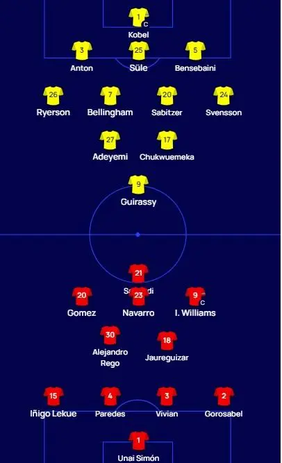 畢包首發(fā):1-烏奈-西蒙、2-戈羅薩貝爾、3-維維安、4-帕雷德斯、15-萊奎、18-豪雷吉薩爾、30-雷戈、21-桑納迪、23-納瓦羅、9-伊納基-威廉姆斯、20-戈麥斯