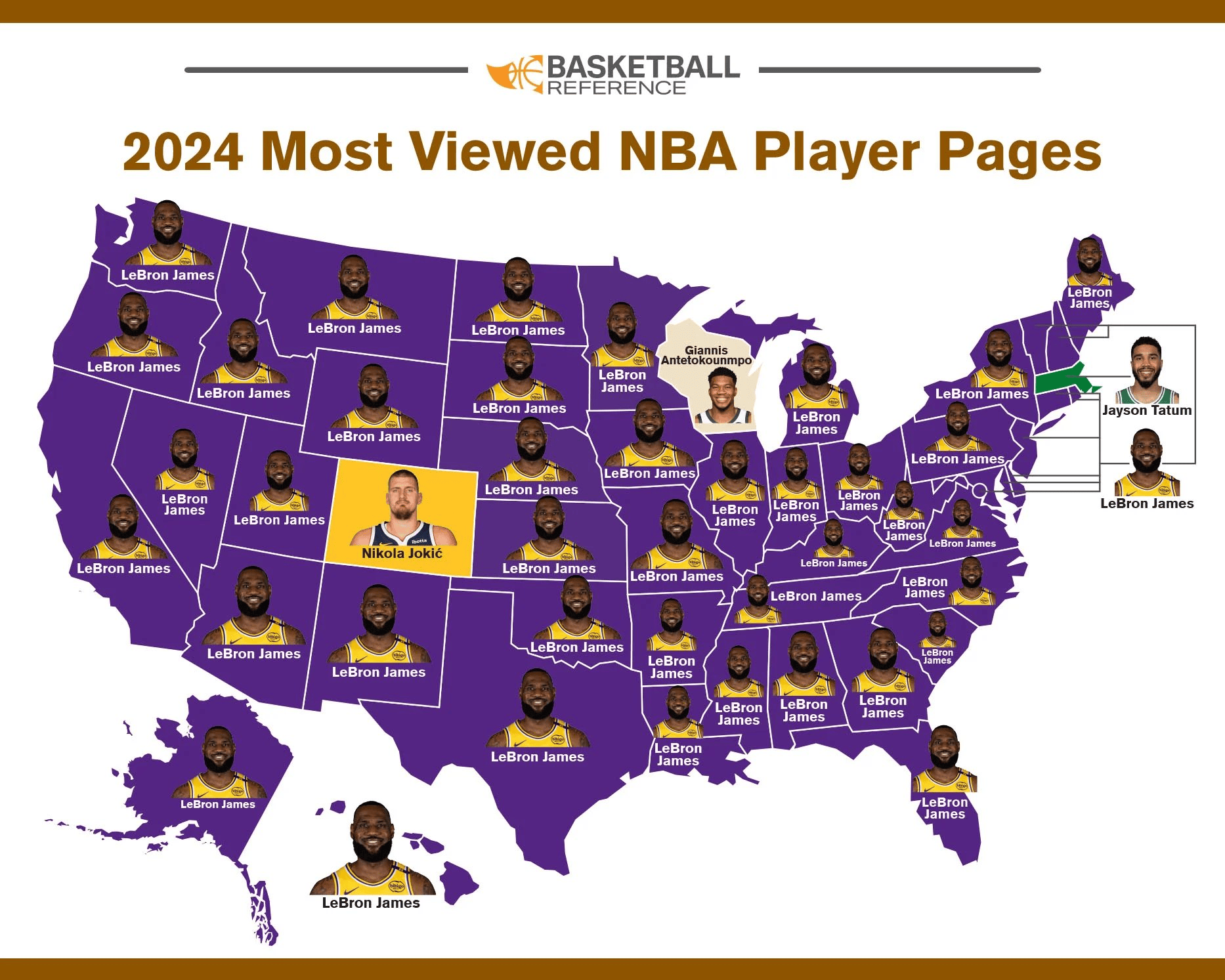 虎撲12月11日訊 今日,美媒Basketball Reference公布了2024年以及2025年美國各地區(qū)觀看最多的星詹球星。