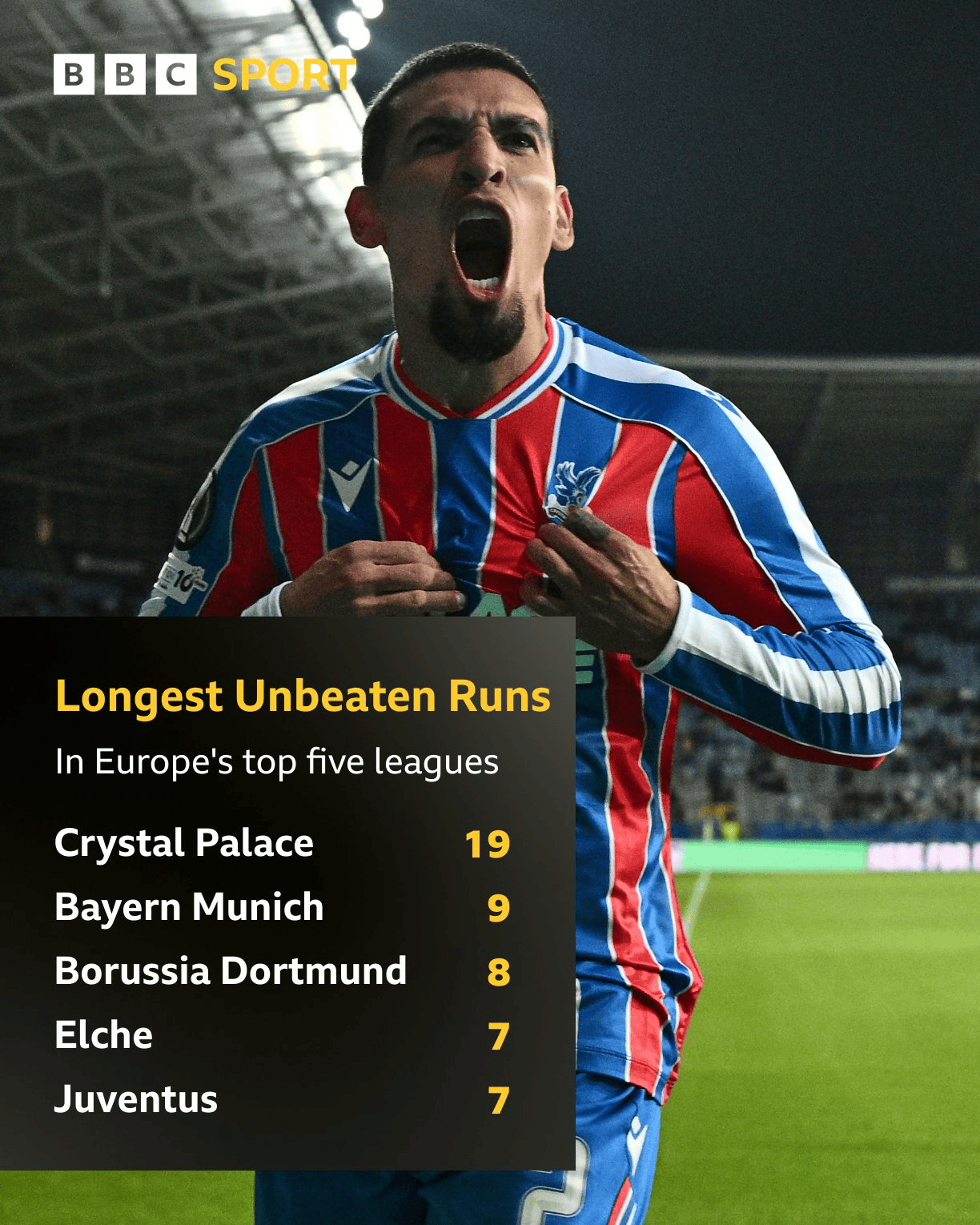 BBC也發(fā)布了統(tǒng)計,宮遙內(nèi)容為五大聯(lián)賽球隊現(xiàn)存連續(xù)不敗場次的遙領(lǐng)排行榜。
