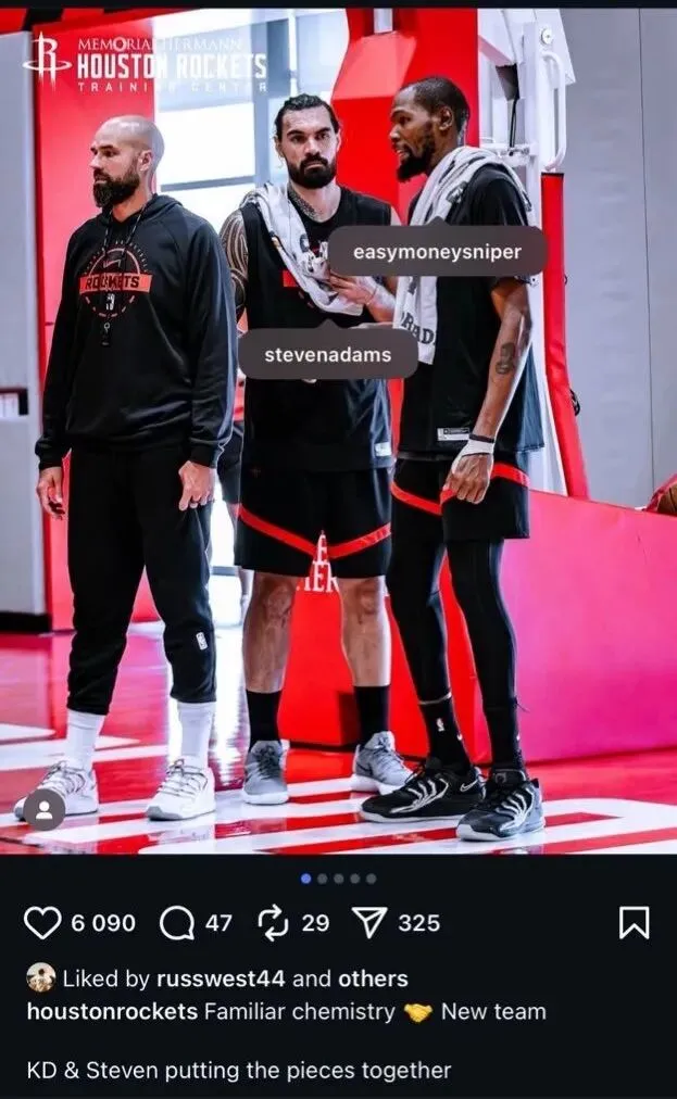 然后重點(diǎn)來了,兩人在雷霆時期的隊友、如今還是自由球員的威少點(diǎn)贊了這張照片,此舉也引起了不少球迷猜測:威少是否有加盟火箭的可能?