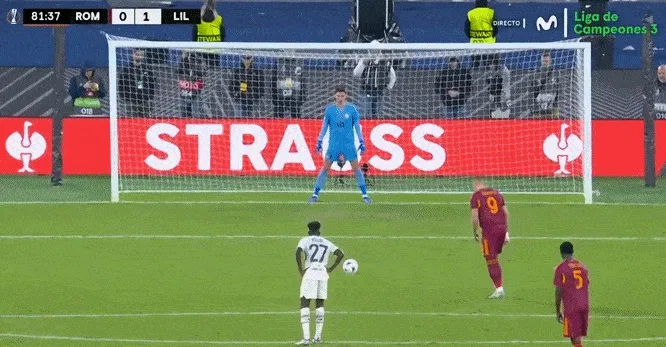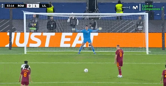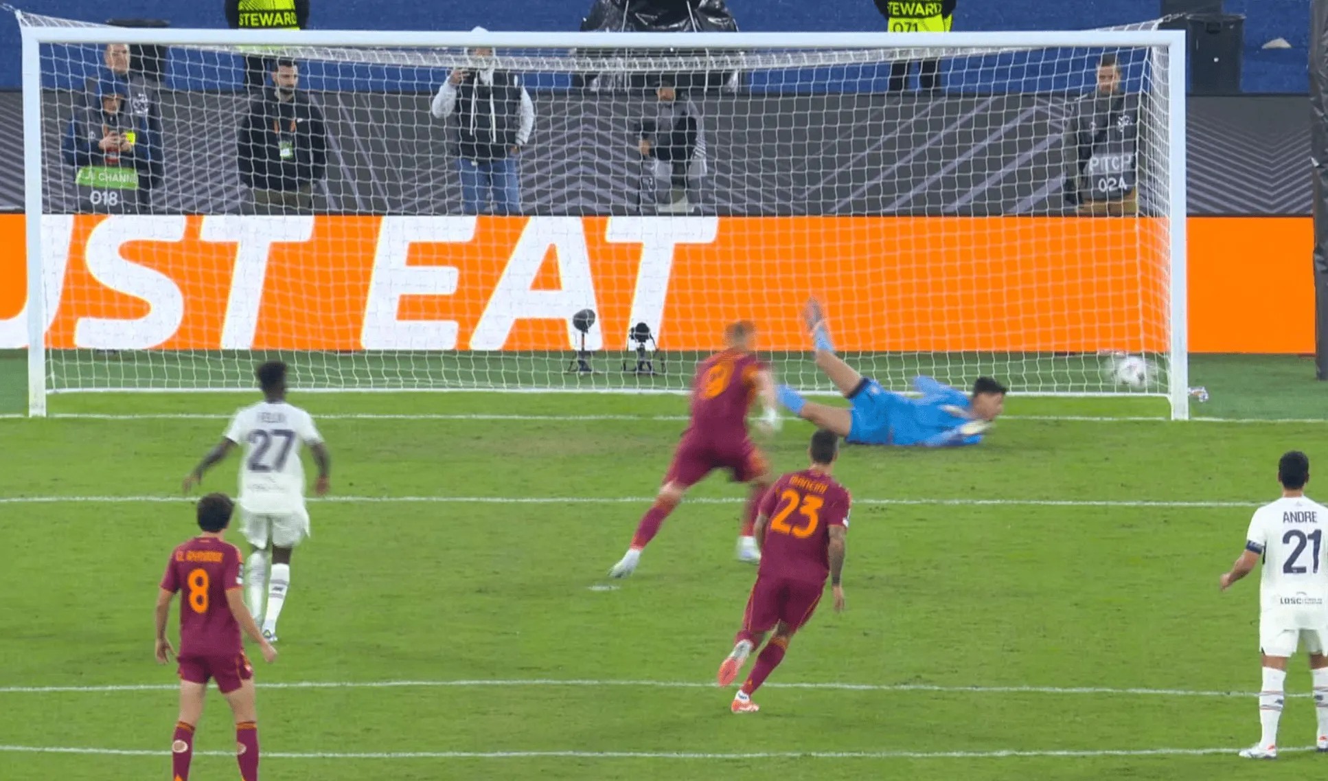 羅馬在第85分鐘獲得了一粒點(diǎn)球,但多夫比克主罰的點(diǎn)球被里爾門將厄澤爾撲出。